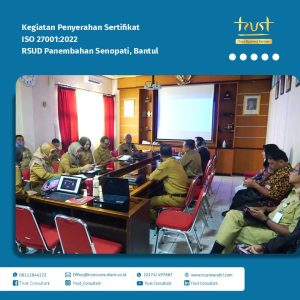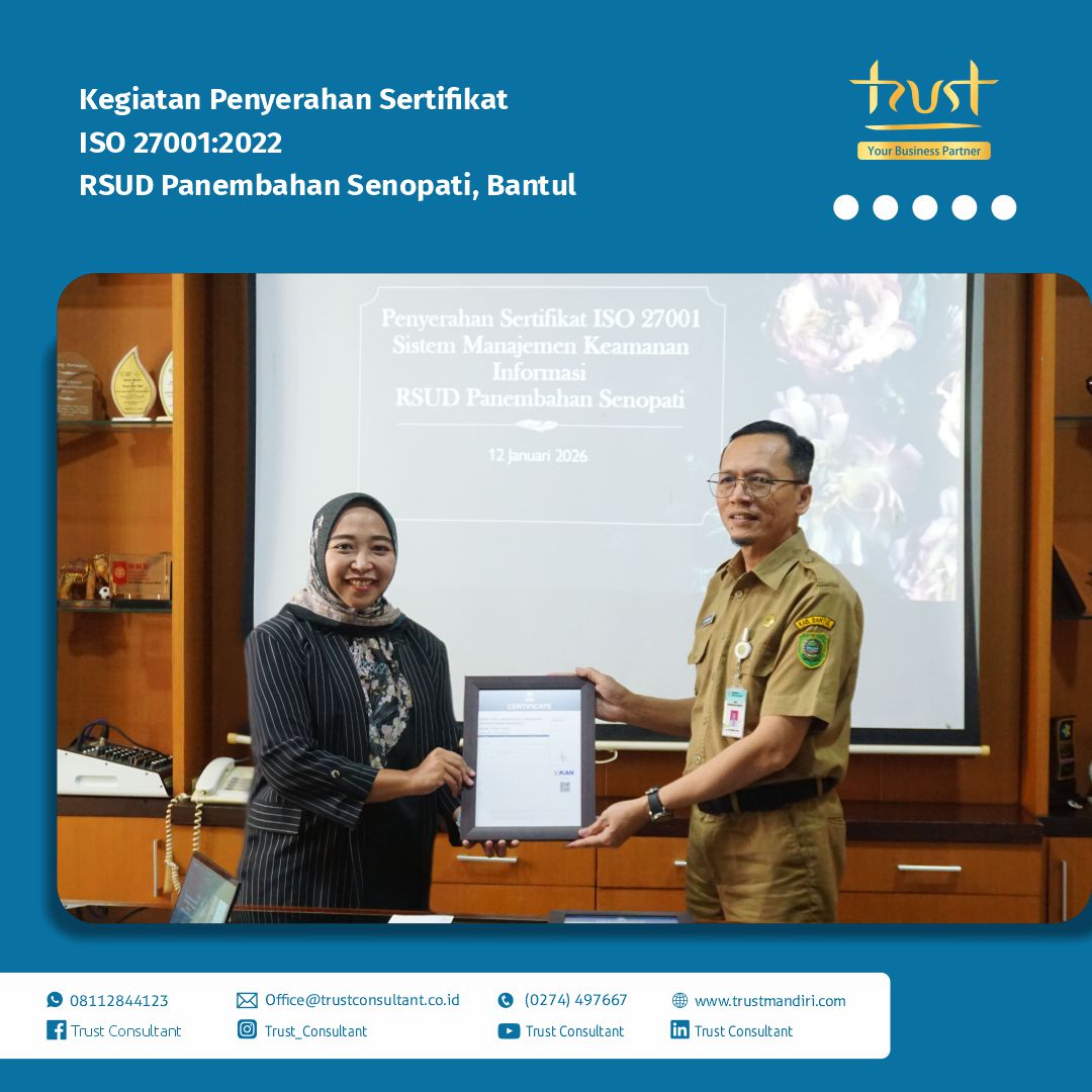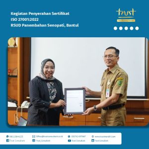Kegiatan Penyerahan Sertifikat ISO 27001:2022 pada RSUD Panembahan Senopati, BantulPublished by Trust Consultant on April 10, 2026 Categories: gallery Tags: 027449766708112654585iso 27001Jasa Konsultan ISOKlien Trust mandiriRSUD Panembahan SenopatiSistem Manajemen Keamanan Informasi 0 Comments Leave a Reply Cancel reply Your email address will not be published. Required fields are marked * Name * Email * Website What's on your mind? Save my name, email, and website in this browser for the next time I comment. Δ